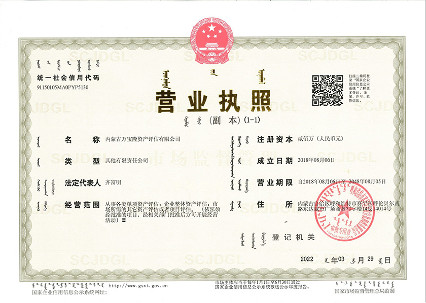 資產(chǎn)評(píng)估公司營(yíng)業(yè)執(zhí)照正本